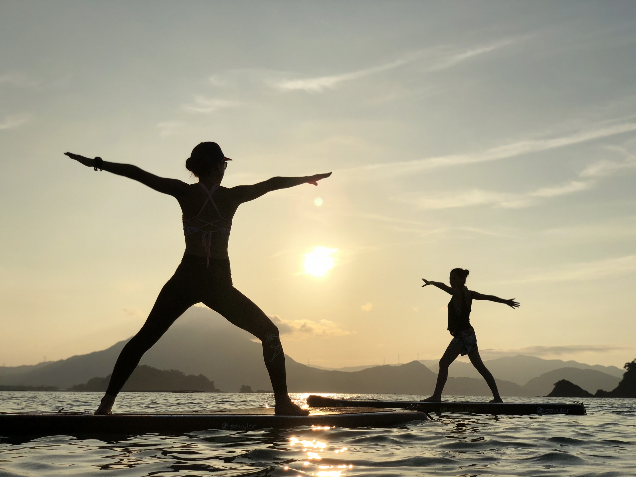夕日が沈む頃の時間帯に行うSUP YOGAは一日の終わりにふさわしい、景色に出会う事ができます。自然への感謝や、一日の充実感が自然と湧き上がる時間になるでしょう。